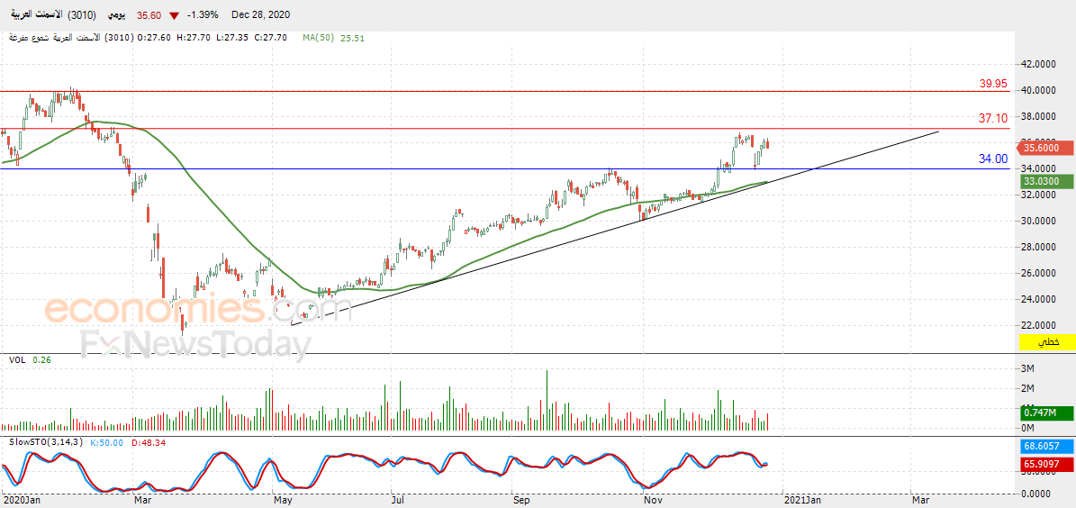 نطاق التداول المتوقع لهذا اليوم ما بين مستوى الدعم 34.70 ومستوى المقاومة 38.00.