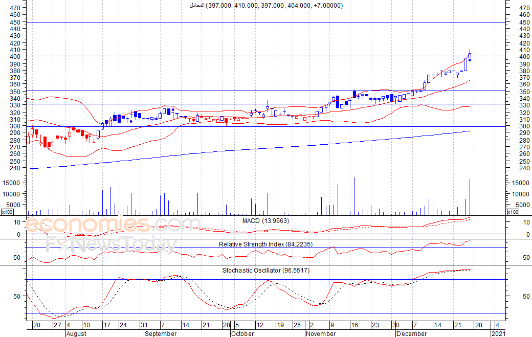 متوقع ان يكون النطاق السعري خلال اليوم الحالي بين مستوى الدعم هو 400 بينما مستوى المقاومة هو 413 فلس