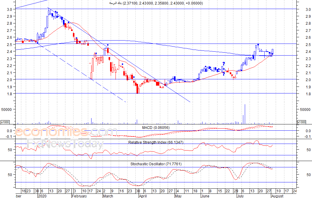 تحرك السهم لأعلى في اخر جلسات الأسبوع الماضي، حيث اغلق عند مستوى 56٫50 فلس، متجاوزا خط الاتجاه الهابط قصير الأجل، وهو ما قد يمنح السهم ارتفاعا لمستويات قد تصل الى 58 فلس كمستوى أول ثم 61٫50 فلس كمستوى ثان وذلك خلال الأيام والاسابيع القادمة، شرط بقاء السهم أعلى مستوى 55٫50 فلس.