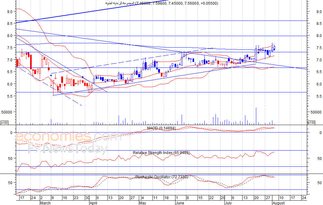 واصل السهم تقدمه كما اشرنا في تقريرنا الاخير، حيث أنهى الأسبوع الماضي تداولاته مرتفعا عند مستوى 7٫56 ريال، في ظل استمرار تداول مؤشر ماكد أعلى خط الصفر، مما نتوقع معه إمكانية استمرار الارتفاع الحالي لمستوى المقاومة التالي عند 8 ريال كمستوى أول ثم 8٫60 ريال كمستوى ثان، شرط بقاء السهم أعلى مستوى 7٫20 ريال.