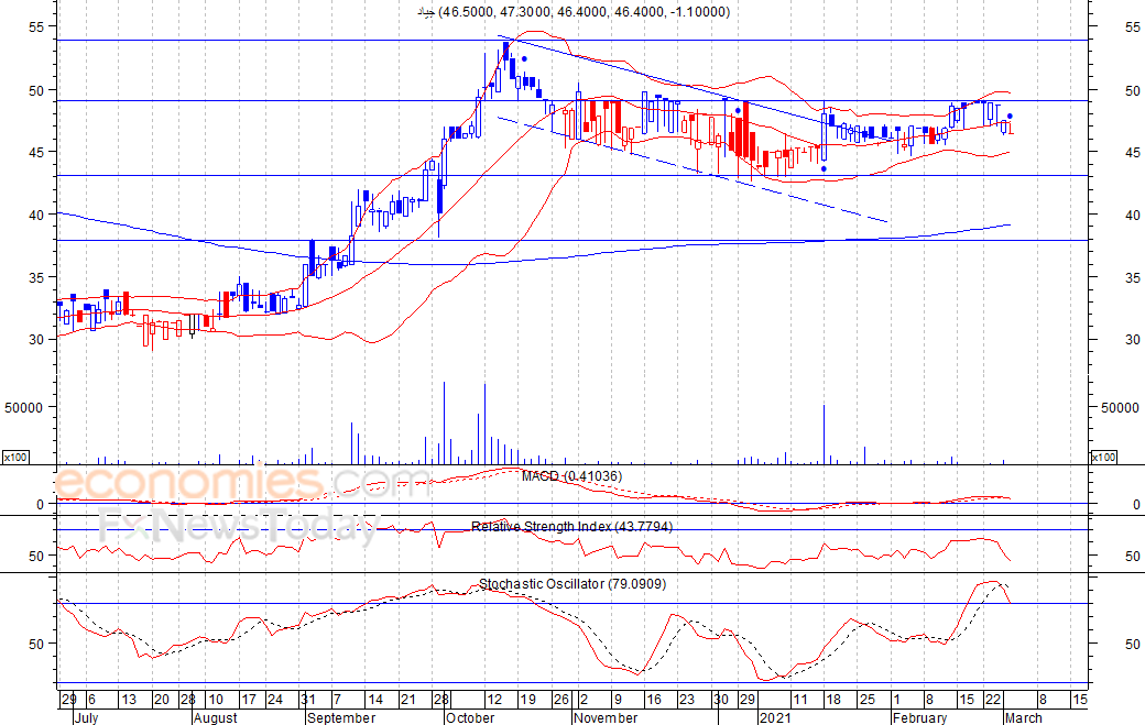 تحرك السهم لأسفل ليغلق امس الثلاثاء عند مستوى 46 فلس، مخترقا بذلك متوسطه المتحرك لـ 20 يوم، مما قد يهبط بالسهم لأسفل للوصول لمستوى الدعم 43 فلس كمستوى أول ثم 38 فلس كمستوى ثان وذلك خلال الأيام والاسابيع القادمة، الا ان هذا السيناريو مرهون بثبات السهم اسفل مستوى 49 فلس.