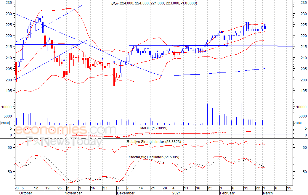 متوقع ان يكون النطاق السعري خلال اليوم الحالي بين مستوى الدعم هو 221.3 بينما مستوى المقاومة هو 224.3 فلس