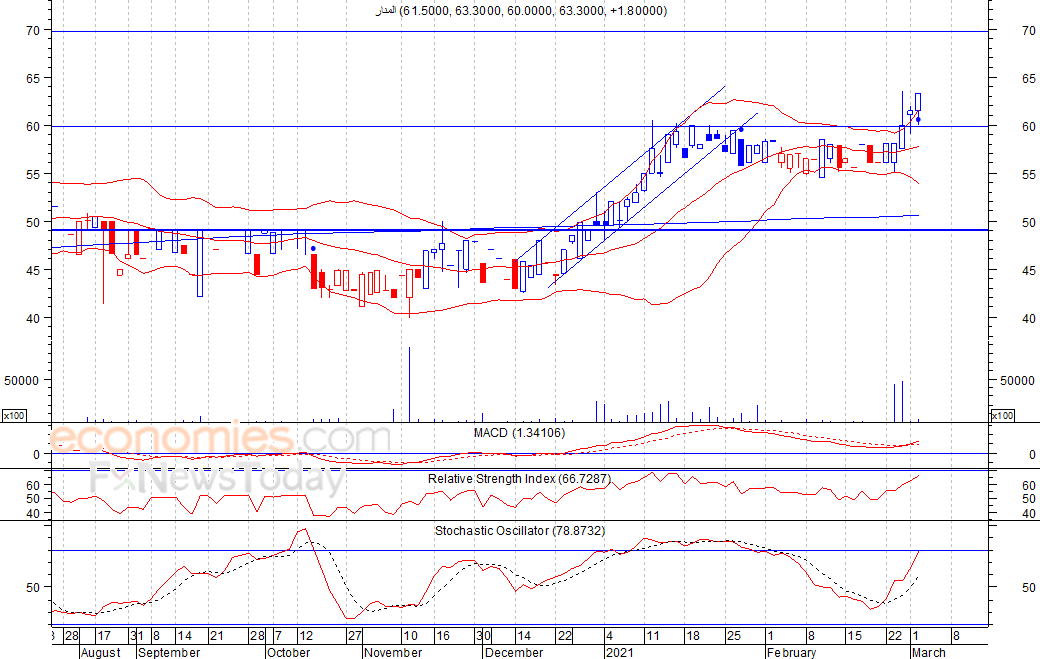 تحرك السهم لأعلى في ثالث جلسات الأسبوع الحالي، حيث اغلق عند مستوى 63.30 فلس، وهو أعلى مستوى يصل اليه السهم خلال الجلسة، كما تمكن السهم من تجاوز مستوى مقاومته السابق عند 60 فلس، لذلك نتوقع ان يمدد السهم مكاسبه للوصول لمستوى المقاومة التالي عند 70 فلس، شرط بقاء السهم أعلى مستوى 60 فلس.
