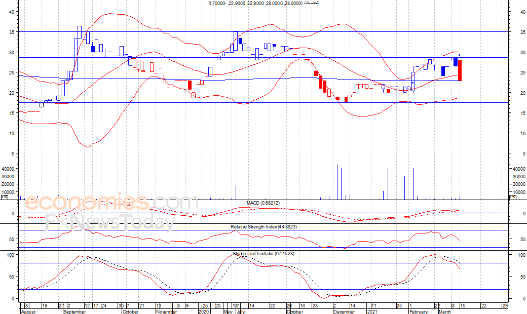 انخفض السهم بشكل كبير خلال تداولات امس الاثنين، حيث اغلق عند مستوى 22.90 فلس، وذلك على خلفية ملامسته لمستوى المقاومة الحالي عند 28 فلس، في ظل انطلاق إشارة بيع على مؤشر استوكاستيك، لذلك نتوقع عمليات جني أرباح قد تصل بالسهم لمستوى الدعم 17 فلس، شرط عدم تجاوز السهم لمستوى 30 فلس.