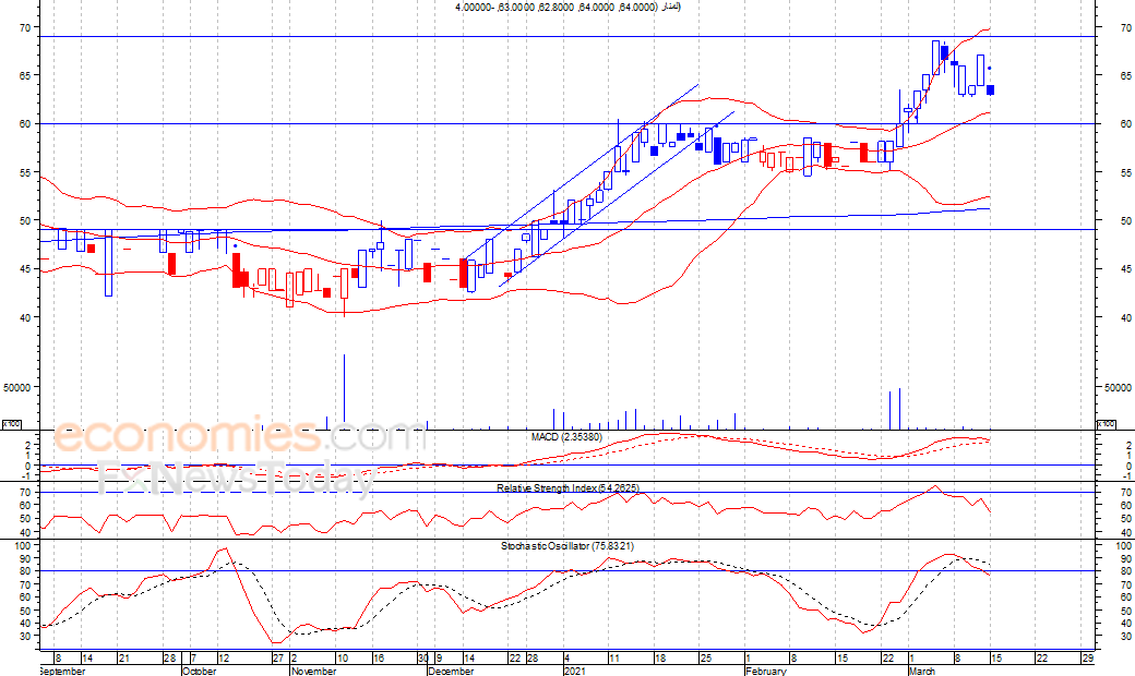 ومن المتوقع ان يكون النطاق السعري خلال جلسة اليوم بين مستوى الدعم هو 62.1 فلس وبين مستوى المقاومة هو 63.7 فلس