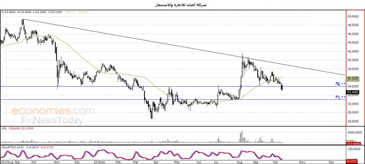 نطاق التداول المتوقع لهذا اليوم ما بين مستوى الدعم 31.00 ومستوى المقاومة 36.00 .