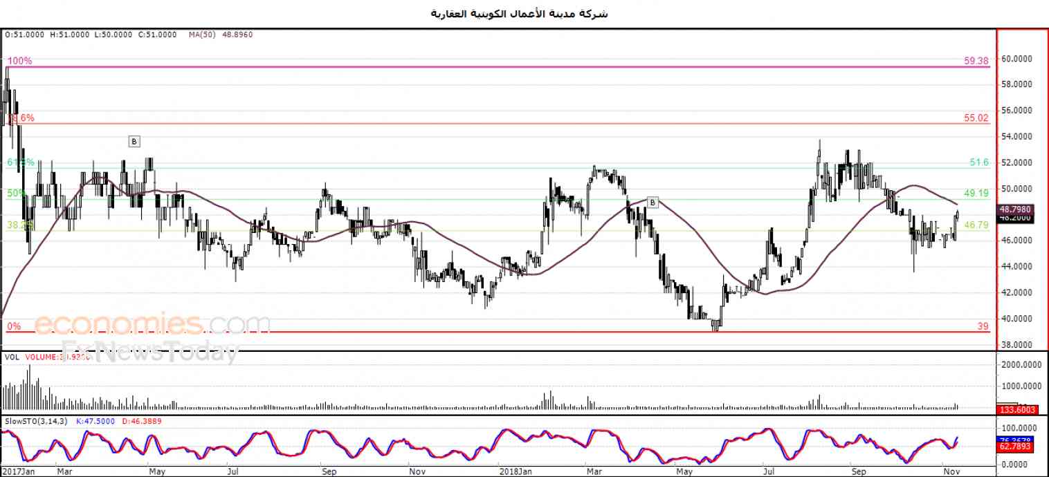 نطاق التداول المتوقع لهذا اليوم ما بين مستوى الدعم 46.79 ومستوى المقاومة 50.00 .