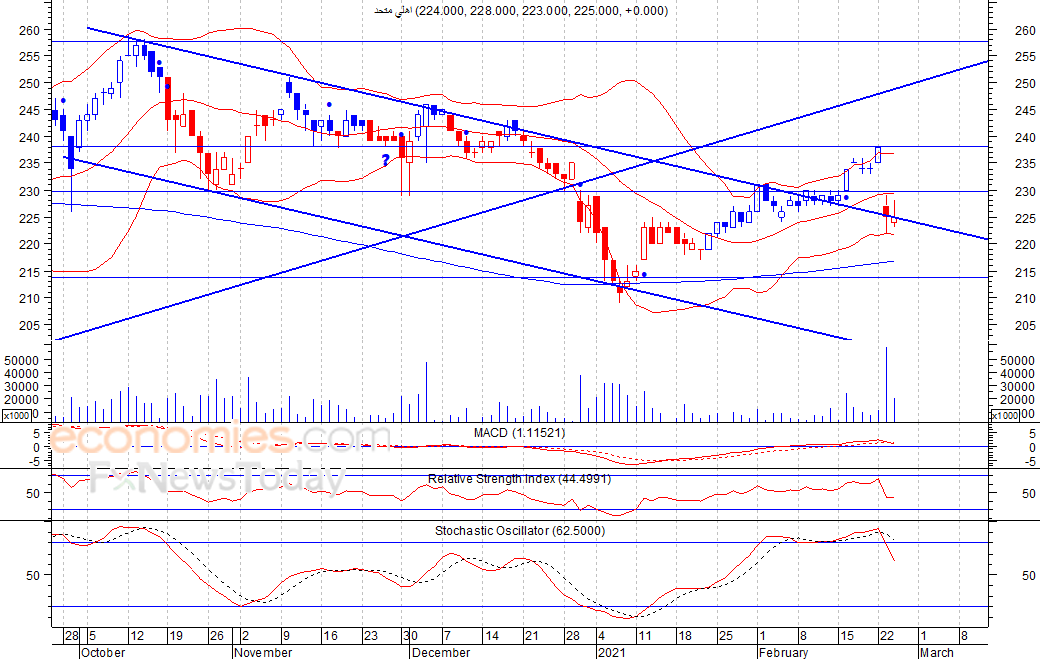 متوقع ان يكون النطاق السعري خلال اليوم الحالي بين مستوى الدعم هو 221 بينما مستوى المقاومة هو 227 فلس