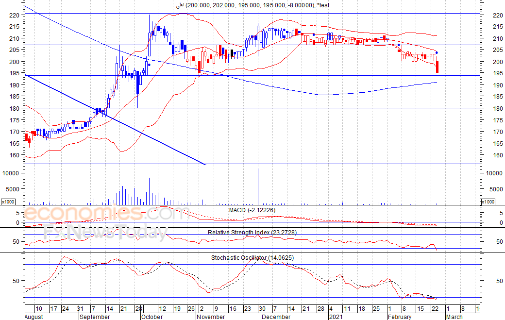 أنهى السهم تداولات الأربعاء الماضي عند أدني مستوى له خلال الجلسة وهو 195 فلس، مما يعكس حالة التشاؤم لدى المتداولين، كما نلاحظ انطلاق إشارة بيع على مؤشر ماكد، مما نتوقع معه استمرار الضغوط البيعية على تداولات السهم للوصول لمستوى الدعم 180 فلس، شرط بقاء السهم اسفل مستوى 202 فلس.