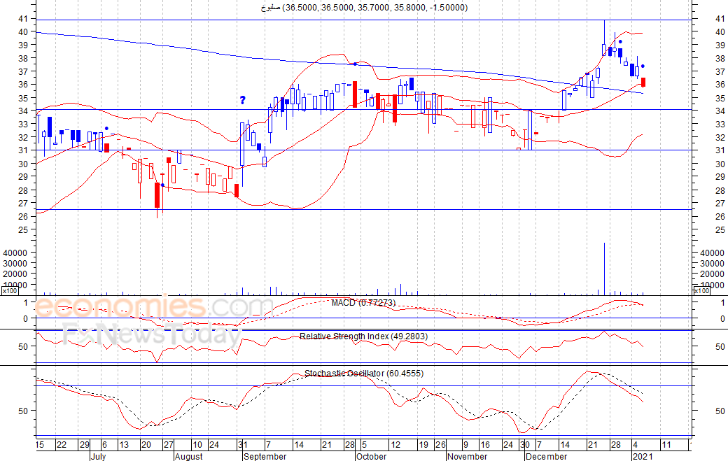 تمكن السهم من الارتفاع خلال تداولات ثالث جلسات الأسبوع الحالي امس الاربعاء، حيث اغلق عند مستوى 35٫80 فلس، لينزلق بذلك السهم اسفل متوسطه المتحرك لـ 20 يوم، لذلك نتوقع ان يمدد السهم تراجعه للوصول لمستوى الدعم 34 فلس، شرط بقاء السهم اسفل مستوى 38 فلس.