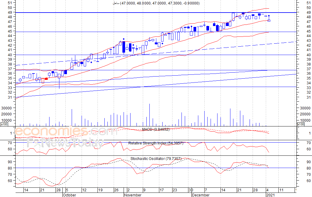 متوقع ان يكون النطاق السعري خلال اليوم الحالي بين مستوى الدعم هو 46.3 بينما مستوى المقاومة هو 47.7 فلس