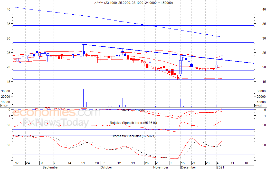 متوقع ان يكون النطاق السعري خلال اليوم الحالي بين مستوى الدعم هو 23.0 بينما مستوى المقاومة هو 25.1 فلس