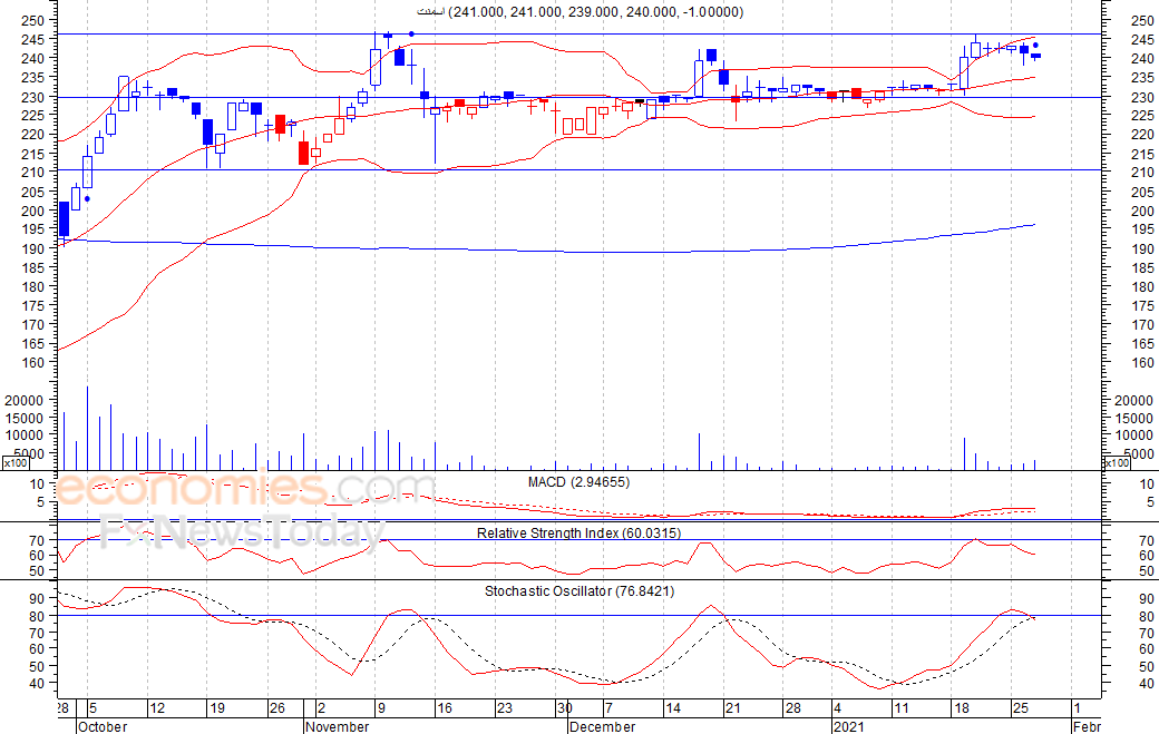 انخفض السهم بشكل طفيف نهاية تداولات امس الاربعاء، حيث اغلق عند مستوى 240 فلس، في ظل استمرار تدني كميات التداول، كما نلاحظ انطلاق إشارة بيع على مؤشر استوكاستيك، لذلك نتوقع عمليات جني أرباح قد تهبط بالسهم لمستوى الدعم 230 فلس كمستوى اول، شرط بقاء السهم اسفل مستوى 246 فلس.