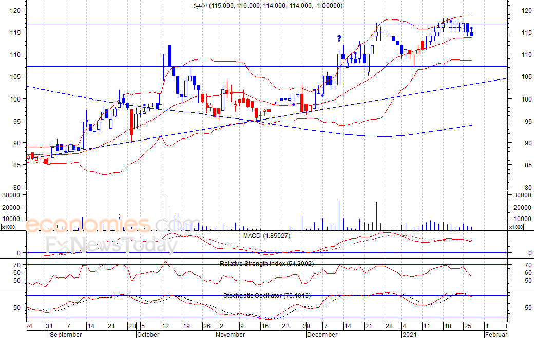 متوقع ان يكون النطاق السعري خلال اليوم الحالي بين مستوى الدعم هو 113.3 بينما مستوى المقاومة هو 115.3 فلس