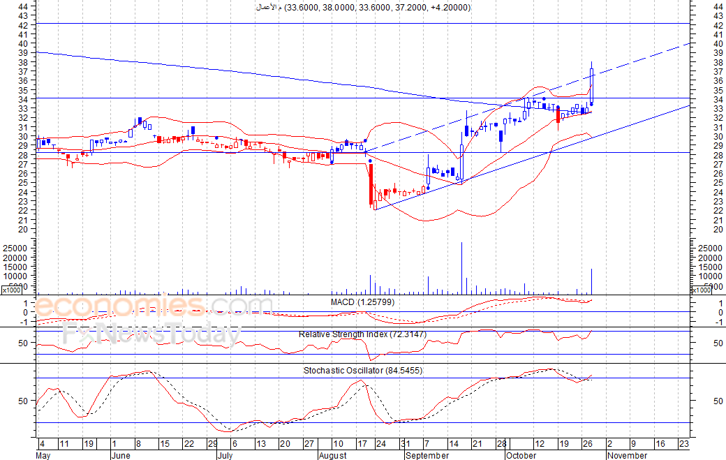شهد السهم ارتفاعا كبيرا خلال جلسة الاربعاء، حيث سيطرت القوى الشرائية على تداولات السهم ليغلق عند مستوى 37٫20 فلس، وهو أعلى مستوى يصل اليه السهم منذ شهر مارس الماضي، مصحوبا بارتفاع ضخم في كمية التداول، مما يدفعنا بالقول بان السهم قد يشهد مزيدا من الارتفاع لمستوى المقاومة 42 فلس، شرط بقاء السهم أعلى مستوى 34 فلس.