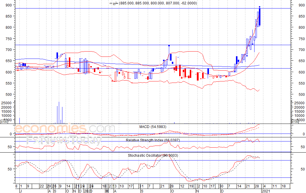 متوقع ان يكون النطاق السعري خلال اليوم الحالي بين مستوى الدعم هو 770 بينما مستوى المقاومة هو 840 فلس