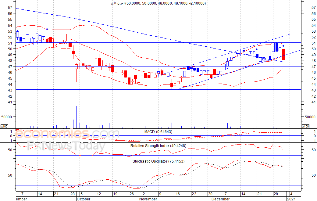 انخفض السهم مرة أخرى لينهي تداولات الأسبوع الماضي عند مستوى 48٫1 فلس، لينزلق بذلك السهم اسفل القناة الصاعدة قصيرة الأجل، وهو ما يفتح الباب أمام السهم لمزيد من الانخفاض لمستويات قد تصل الى 47 فلس كمستوى أول ثم 43 فلس كمستوى ثان، شرط عدم تجاوز السهم لمستوى 51 فلس.