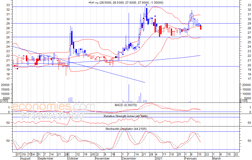 أنهى السهم تداولات امس الأربعاء بدون اي تغيير مقارنة بإغلاقه السابق، حيث اغلق عند مستوى 48 فلس، في ظل انطلاق إشارة بيع على مؤشر استوكاستيك، مما يجعل الصورة الكلية سلبية، لذلك نتوقع انخفاض السهم لمستوى الدعم 43 فلس كمستوى اول، شرط عدم تجاوز السهم لمستوى 52 فلس.
