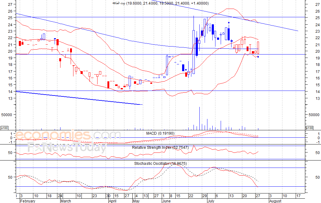 متوقع ان يكون النطاق السعري خلال اليوم الحالي بين مستوى الدعم هو 20.7 بينما مستوى المقاومة هو 22.2 فلس