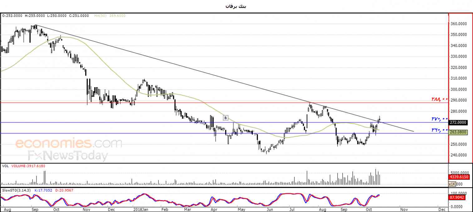 بعد ارتفاع سهم بنك برقان (BURG) في آخر جلساته ليسجل أعلى سعر له عند 276.00 ، ارتد منه انخفاضاً ليمحو جميع تلك المكاسب ، ليغلق على عدم تغيير ، في محاولة منه لاكتساب زخماً إيجابياً قد يساعده على الارتفاع ، في ظل تأثره باختراق خط اتجاه رئيسي هابط على المدى المتوسط ، وبدعم إيجابي متواصل للمتوسط المتحرك البسيط لفترة 50 يوماً السابقة .