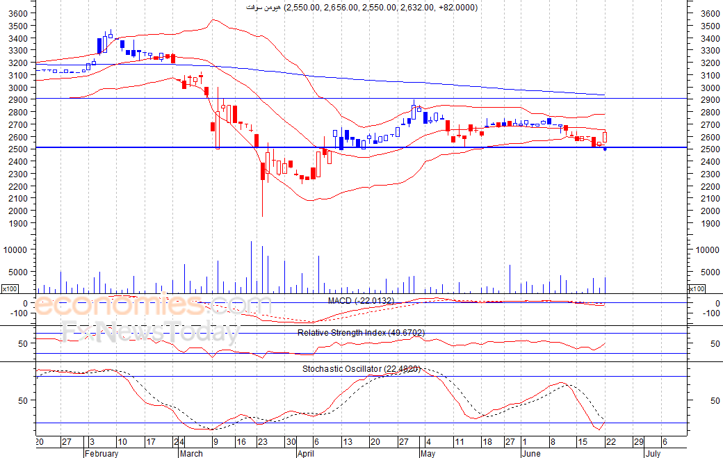ارتد السهم لأعلى لينهي تداولات امس الاثنين ليغلق عند مستوى 2632 فلس، وذلك على خلفية ملامسته لمستوى الدعم 2500 فلس، وبالتزامن مع انطلاق إشارة شراء على مؤشر استوكاستيك، لذلك نتوقع ان يمدد السهم مكاسبه للوصول لمستوى المقاومة القوي عند 2900 فلس، شرط بقاء السهم أعلى مستوى 2500 فلس.