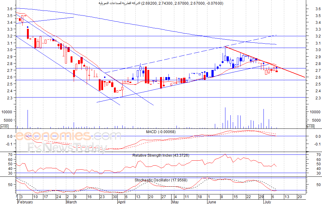 تلقى السهم مقاومة قوية عند مستوى 2٫75 ريال، حيث قابل خط الاتجاه الهابط قصير الأجل، والذي يشكل مقاومة دفعت السهم لأسفل ليغلق عند مستوى 2٫67 ريال امس الاربعاء، كما نلاحظ ا نطلاق إشارة بيع على مؤشر ماكد، لذلك نتوقع ان يشهد السهم عمليات جني أرباح قد تهبط به لمستوى الدعم 2٫55 ريال كمستوى اول، شرط بقاء السهم اسفل مستوى 2٫75 ريال٫