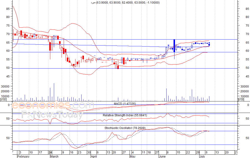 مازال السهم يتعرض للضغوط البيعية، حيث تراجع امس الأربعاء ليغلق عند مستوى 63 فلس، وذلك بعدما تلقى مقاومة قوية عند مستوى 67 فلس، وبالتزامن مع انطلاق إشارة بيع على مؤشر استوكاستيك، لذلك نتوقع ان يشهد السهم عمليات جني أرباح قد تهبط به لمستوى الدعم 59 فلس كمستوى أول، شرط بقاء السهم اسفل مستوى 67 فلس.