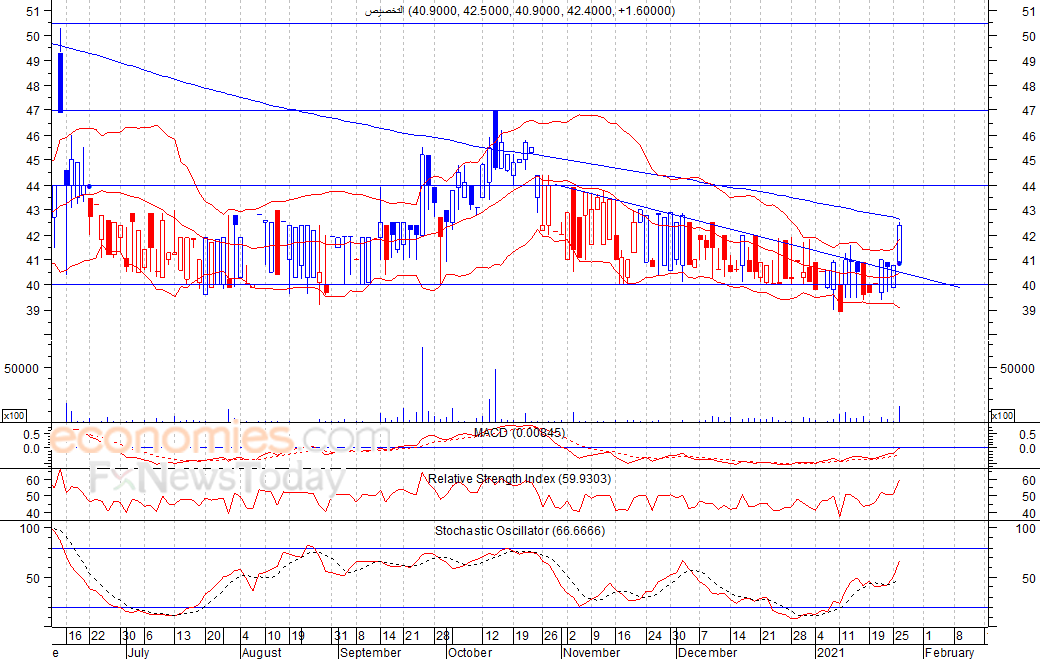 متوقع ان يكون النطاق السعري خلال اليوم الحالي بين مستوى الدعم هو 41.7 بينما مستوى المقاومة هو 43.0 فلس