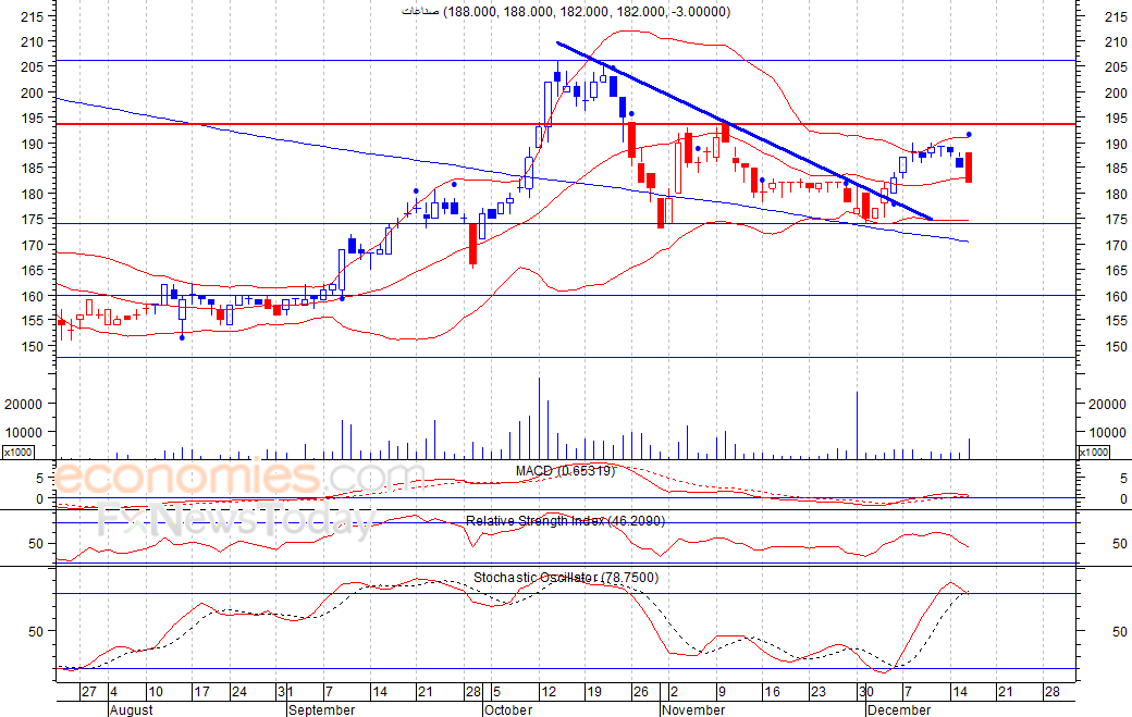 استهل السهم تداولات امس الأربعاء مرتفعا عند مستوى 188 فلس، الا انه اغلق منخفضا عند مستوى 182 فلس، مكون نموذج "Bearish Engulfing” وهو من الشموع اليابانية العاكسة للاتجاه الصاعد، لذلك نتوقع عمليات جني أرباح قد تهبط به لمستوى الدعم 173 فلس كمستوى أول ثم 160 فلس كمستوى ثان، شرط بقاء السهم اسفل مستوى 193 فلس.