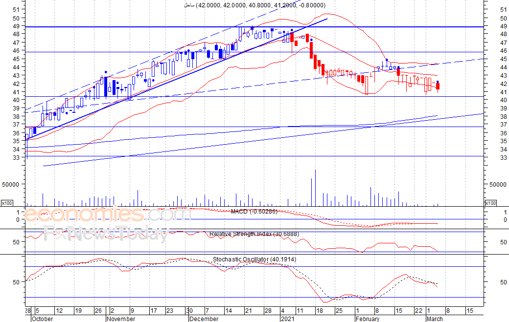 متوقع ان يكون النطاق السعري خلال اليوم الحالي بين مستوى الدعم هو 40.7 بينما مستوى المقاومة هو 41.9 فلس