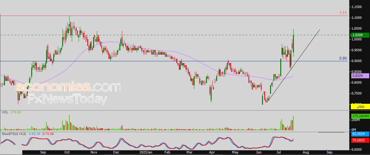 لذلك فتوقعاتنا تشير إلى صعود سعر السهم خلال تداولاته القادمة، طيلة ثبات الدعم 0.90 ريال، ليستهدف مستوى المقاومة المحوري 1.11 ريال.