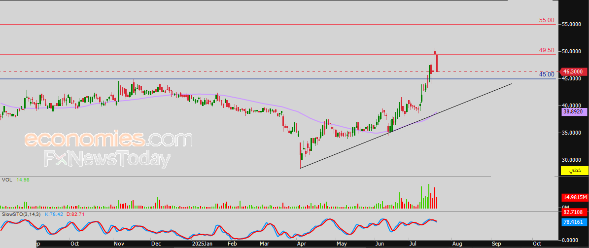لهذا تشير توقعاتنا إلى عودة صعود سعر السهم خلال تداولاته القادمة، خاصة طيلة استقراره أعلى الدعم المحوري 45.00 دينار، وخاصة في حالة اختراقه للمقاومة الحالية 49.50 دينار، ليستهدف بعدها مقاومته التالية عند سعر 55.00 دينار.