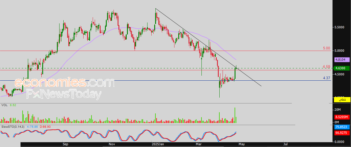 لذلك فتوقعاتنا تقف على الحياد انتظاراً لسلوك السهم حيال مستوى المقاومة المهم 4.59 درهم، بالرغم من استقراره أعلاه حتى الآن ولكن نحتاج لتأكيد بإغلاق آخر لاختراق تلك المقاومة حيث سيتزامن ذلك مع اختراقه لخط الاتجاه الهابط، ليستهدف بعدها مستوى المقاومة 5.00 درهم.