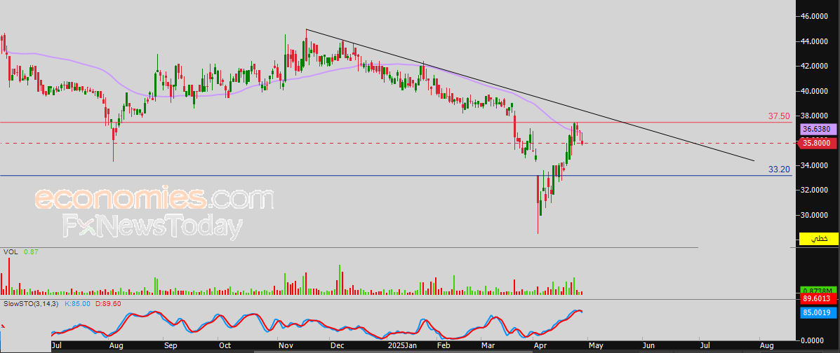 وبناءاً على ذلك فتوقعاتنا تشير إلى المزيد من الهبوط لسعر السهم خلال تداولاته القادمة، طيلة ثبات مستوى المقاومة 37.50 دينار، ليستهدف مستوى الدعم 33.20 دينار.