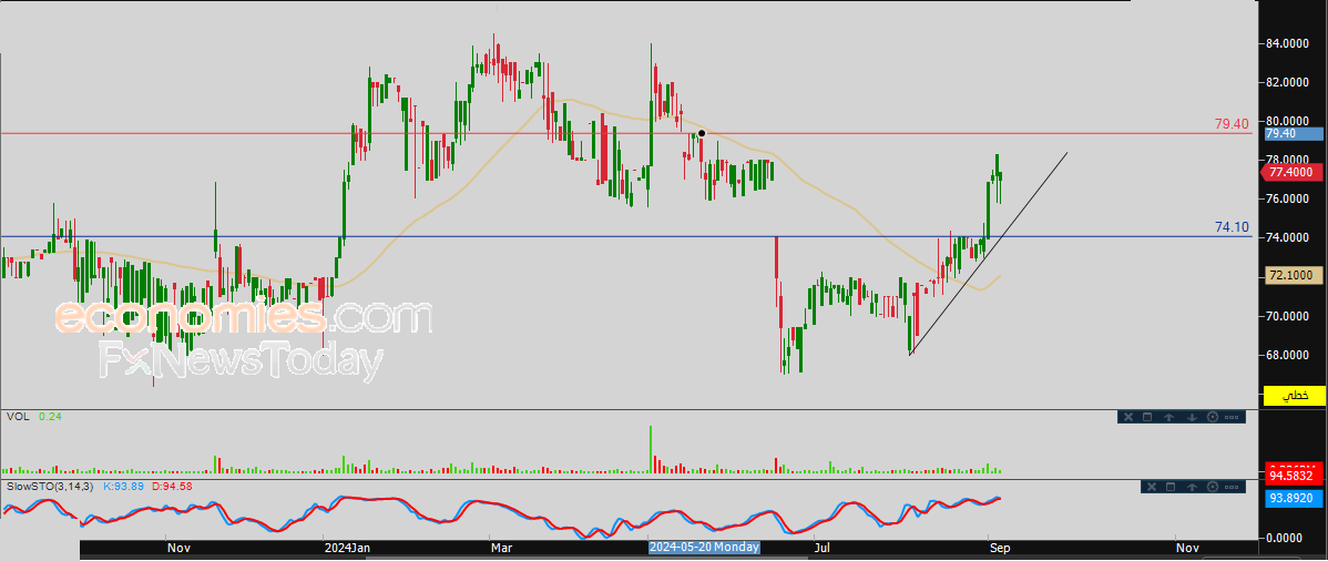 لهذا تشير توقعاتنا إلى ترجيح سيناريو عودة ارتفاع سعر السهم خلال تداولاته القادمة، طيلة ثبات مستوى الدعم 74.10، ليستهدف مستوى المقاومة 79.40.