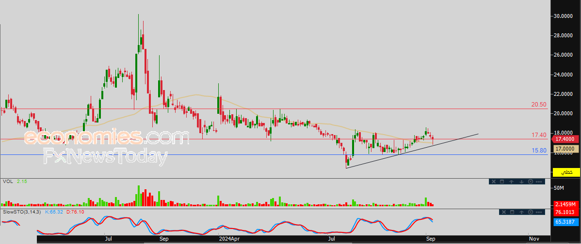 لذلك نحن نرجح عودة صعود سعر السهم خلال تداولاته القادمة، خاصة في حالة عودة استقراره أعلى مستوى 17.40، ليستهدف بعدها مستوى المقاومة 20.50.