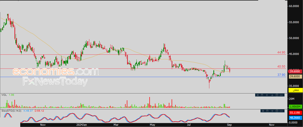 لهذا فتوقعاتنا ترجح عودة صعود سعر السهم خلال تداولاته القادمة، بشرط ثبات مستوى الدعم 37.90، وخاصة في حالة اختراقه للمقاومة الحالية 40.50، ليستهدف بعدها مستوى المقاومة 44.90.