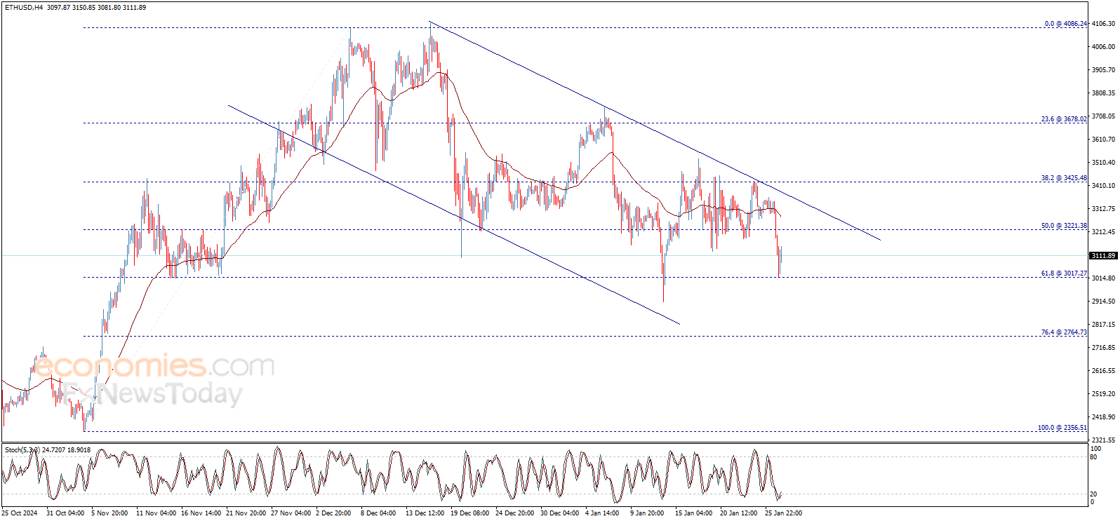 حقق سعر الإيثريوم (ETHUSD) بعض المكاسب المؤقتة ويعود للانخفاض من جديد، بانتظار كسر مستوى 3017.30$ لتأكيد امتداد الموجة الهابطة وتحقيق أهداف سلبية جديدة تمتد إلى 2765.00$، لنستمر بترجيح الاتجاه الهابط للفترة القادمة ما لم يتم اختراق مستوى 3222.00$ والثبات فوقه.