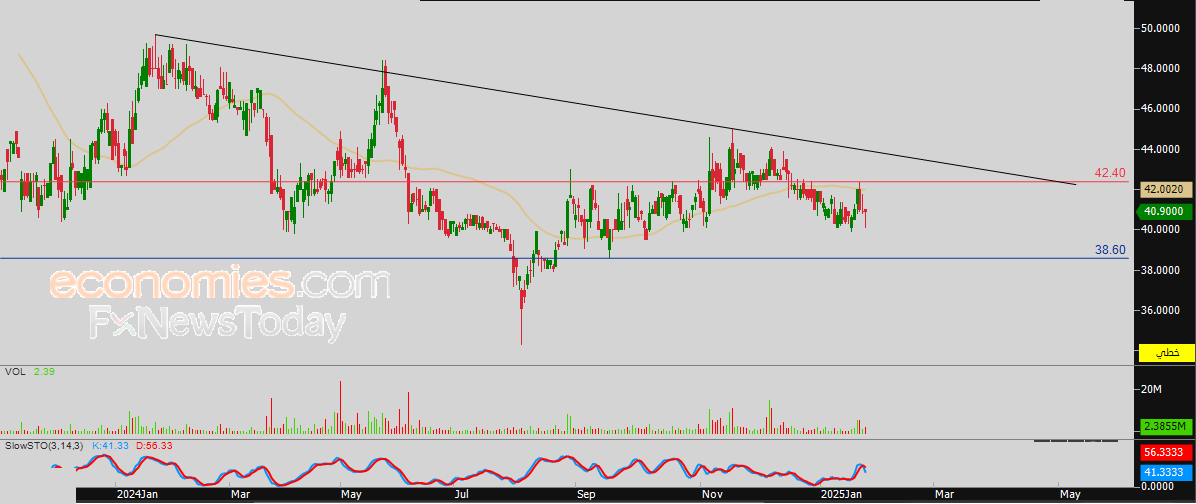 لذلك نحن نتوقع انخفاض سعر السهم خلال تداولاته القادمة، طيلة ثبات مستوى المقاومة 42.40 دينار، ليستهدف مستوى الدعم 38.60 دينار.