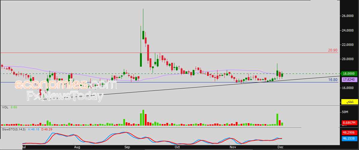 وعلى ضوء ذلك فتوقعاتنا تشير إلى صعود سعر السهم خلال تداولاته القادمة، بشرط ثبات مستوى الدعم المحوري 16.80 دينار، ليستهدف مستوى المقاومة 20.90 دينار.