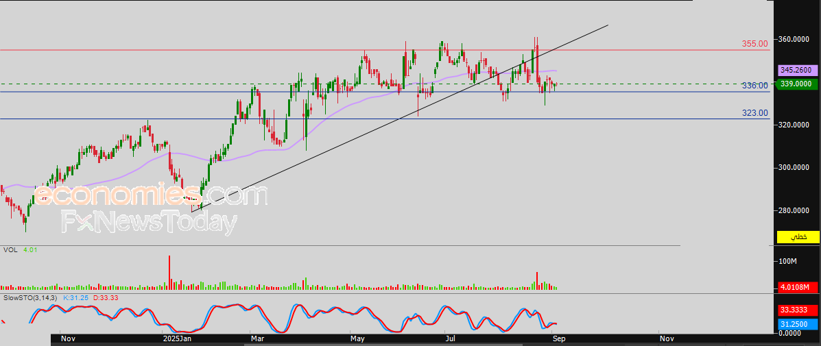 لهذا فتوقعاتنا تشير إلى انخفاض سعر السهم خلال تداولاته القادمة، خاصة في حالة كسره للدعم المذكور 336.00 ريال، ليستهدف بعدها مستوى الدعم التالي له عند سعر 323.00 دينار.