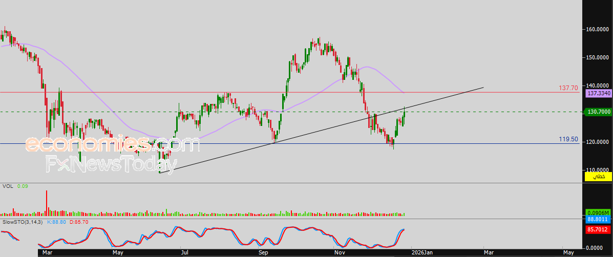 على هذا الأساس فتوقعاتنا تميل نحو هبوط سعر السهم خلال تداولاته القادمة، طيلة ثبات مستوى المقاومة 137.70 ريال، ليستهدف مستوى الدعم المحوري 119.50 ريال.