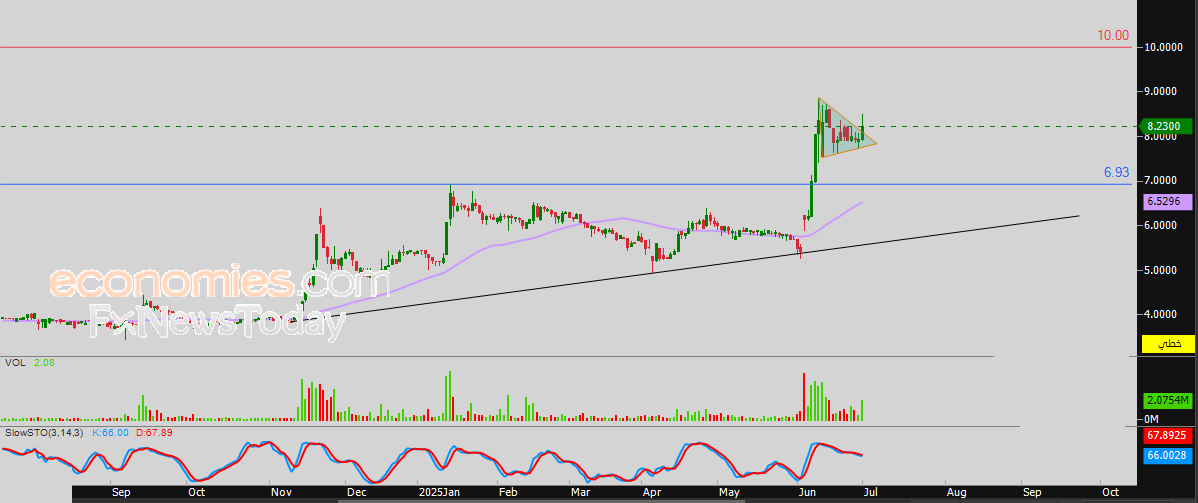 لهذا فتوقعاتنا تشير إلى صعود سعر السهم خلال تداولاته القادمة، طيلة ثبات الدعم 6.93 درهم، ليستهدف مستوى المقاومة 10.00 درهم.