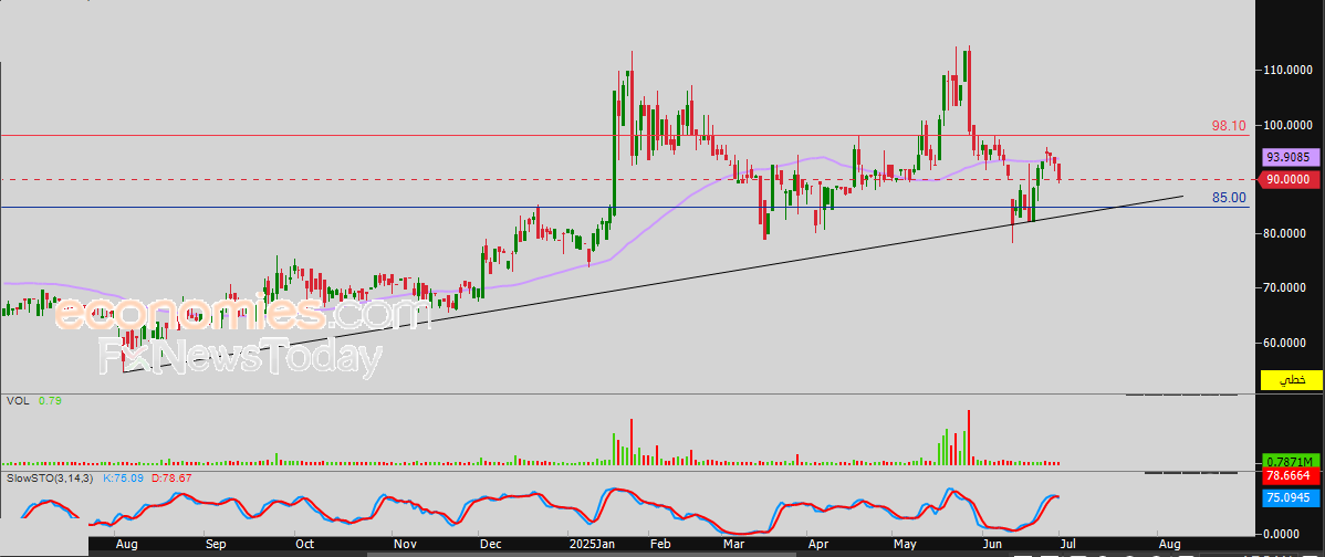 لذلك تشير توقعاتنا إلى عودة صعود سعر السهم خلال تداولاته القادمة، بشرط ثبات مستوى الدعم 85.00 دينار، ليستهدف مستوى المقاومة 98.10 دينار.