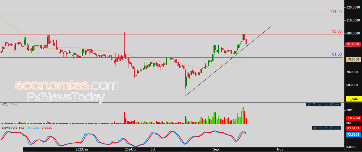 لهذا تشير توقعاتنا إلى ترجيح سيناريو عودة صعود سعر السهم خلال تداولاته القادمة، خاصة في حالة اختراقه لمستوى المقاومة 98.90، ليستهدف بعدها مستوى المقاومة 114.00.