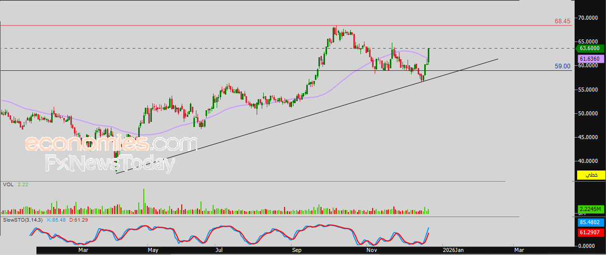 لذلك فتوقعاتنا تشير إلى صعود سعر السهم خلال تداولاته القادمة، طيلة ثبات مستوى الدعم 59.00 ريال، ليستهدف مستوى المقاومة المحوري 68.45 ريال.