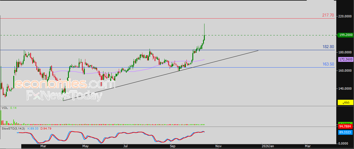 لذلك تشير توقعاتنا إلى صعود سعر السهم خلال تداولاته القادمة، طيلة ثبات مستوى الدعم 182.80 ريال، ليستهدف مستوى المقاومة 217.70 ريال.