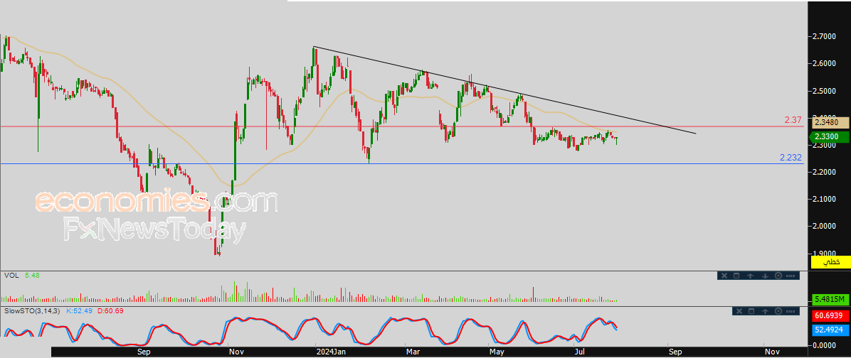 لذلك نحن نرجح عودة انخفاض سعر السهم خلال تداولاته القادمة، طيلة استقراره دون مستوى المقاومة 2.37، ليستهدف مستوى الدعم المحوري 2.232.