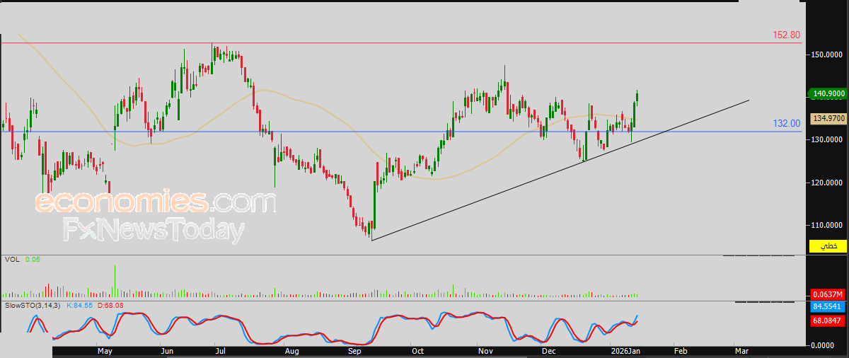 لذلك فتوقعاتنا تشير إلى صعود سعر السهم خلال تداولاته القادمة، طيلة ثبات مستوى الدعم 132.00 ريال، ليستهدف مستوى المقاومة المحوري 152.85 ريال.