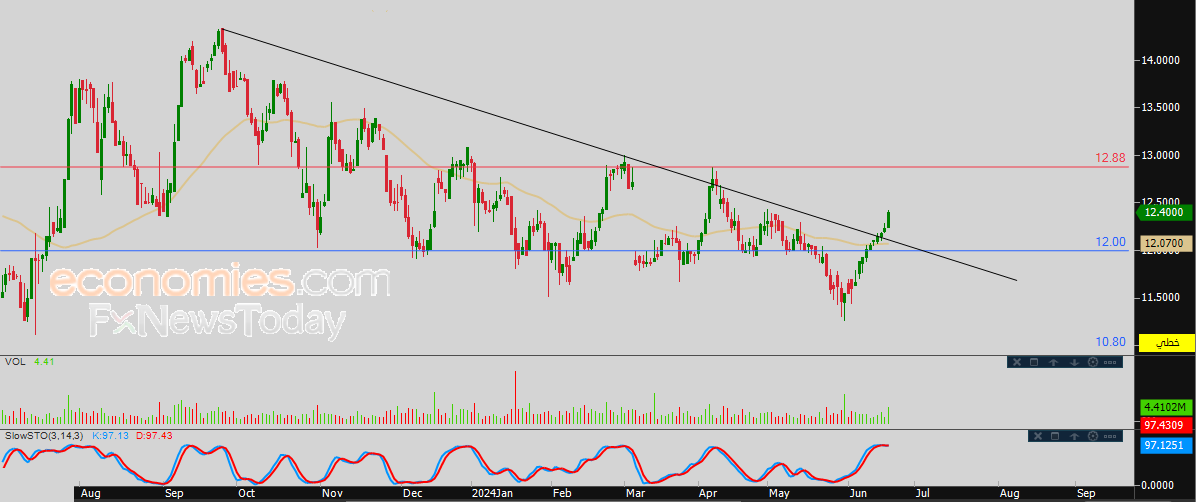 لهذا فتوقعاتنا تشير إلى استمرار صعود السهم خلال تداولاته القادمة، طيلة ثبات مستوى الدعم 12.00، ليستهدف مستوى المقاومة المهم 12.88.
